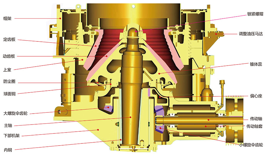 1、提高生產與功效效率,采用主軸固定,偏心套繞主軸旋轉的結構,可承受更大的破碎功率。合理的偏心距、腔型和運動參數配合,大大提高了生產能力和工作效率。
