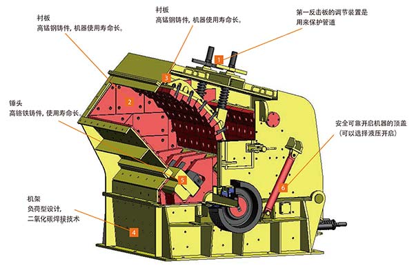 2、長壽命低成本,直線型板錘材質是高鉻鑄鐵,帶有軸對稱齒,在一段磨損的情況下可掉頭使用;反擊襯板為折線形設計,使用視磨損情況可互調位置,以延長使用壽命,節約成本。